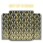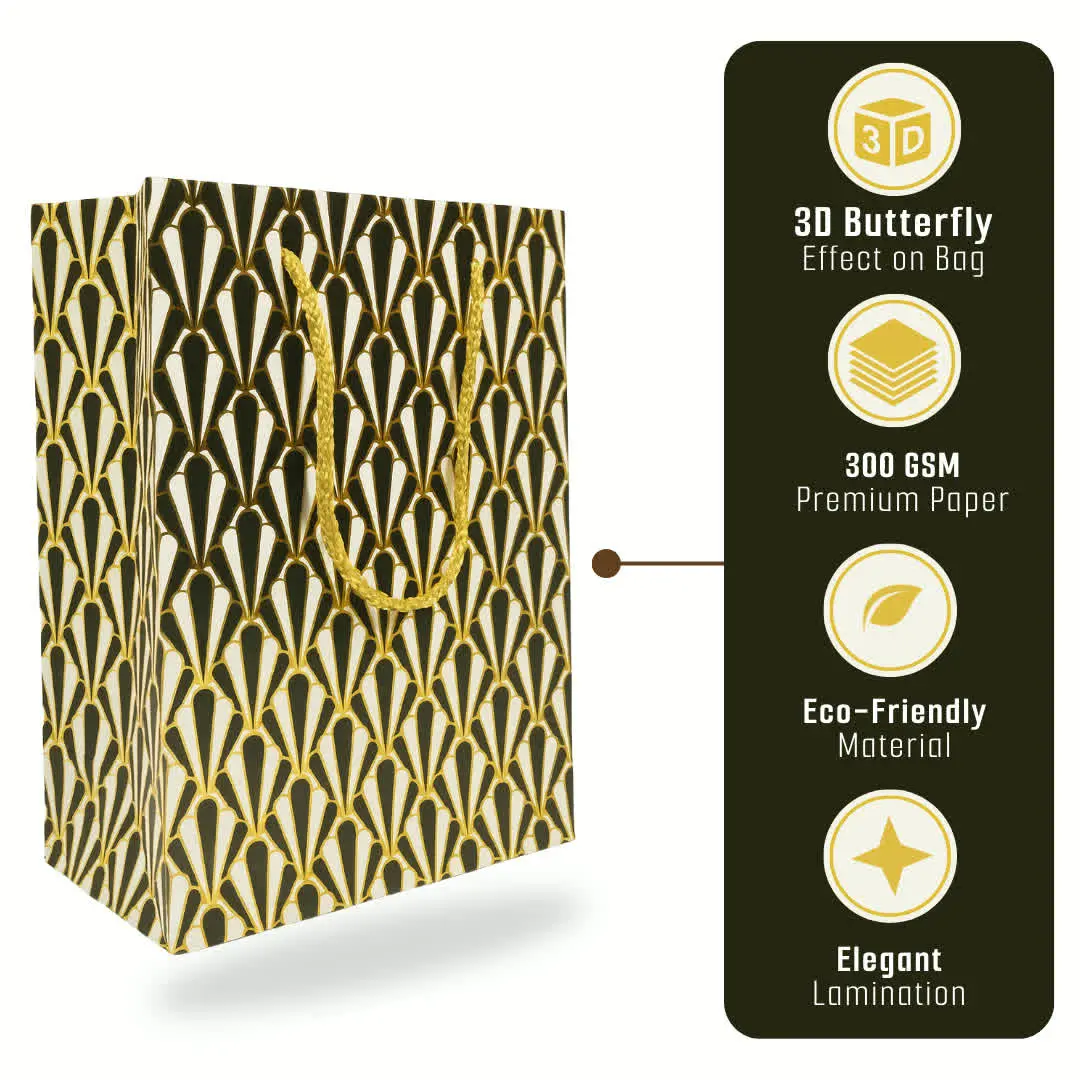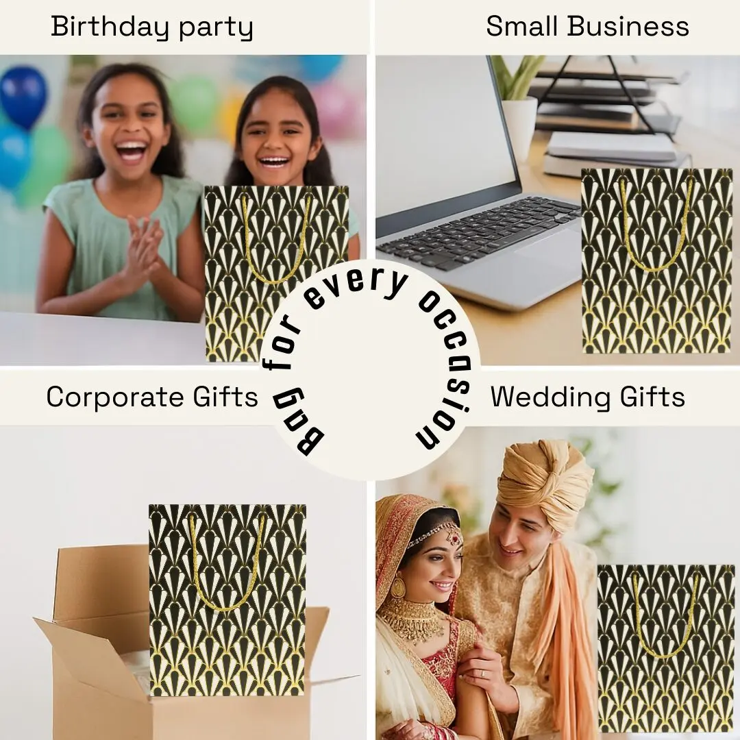 Bring elegance and style to your gifting with this Paper Gift Bags featuring Diamond, Fan, Chevron, and Scallop designs in classy black and gold. Made from durable eco-friendly paper with sturdy golden rope handles, these reusable carry bags are perfect for weddings, birthdays, parties, festivals, and return gifts. The glossy finish and modern geometric patterns make your presents look extra special without the need for wrapping. Ideal for gifting clothes, books, accessories, or party favors, these decorative bags combine strength, beauty, and sustainability—making them a must-have choice for every celebration.